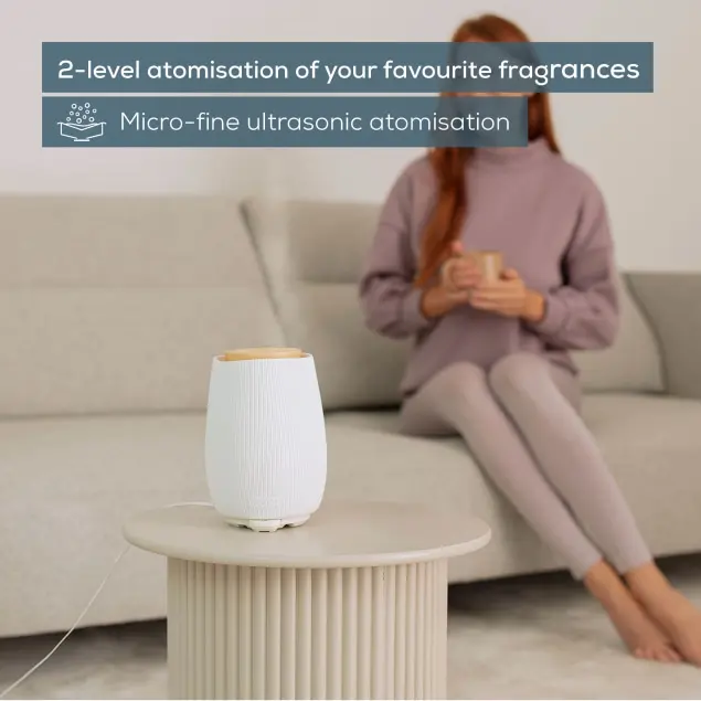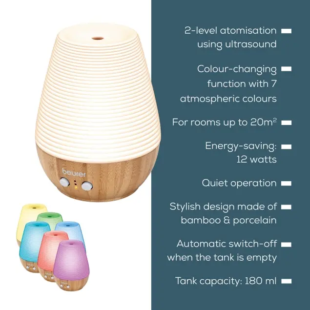 Feel at home in your space – the Aroma diffuser LA 45 by Beurer combines stylish design made of wood and ceramic with modern, micro-fine ultrasound technology. Gentle, dimmable LED light in 9 colours, quiet operation, and aroma oils with your favourite fragrances create a soothing atmosphere – sustainable, energy-saving, and good for the soul.