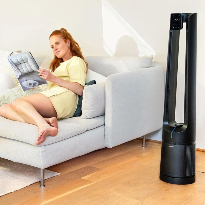 Enjoy fresh, clean air and soothing cooling from a device that can do both. The 2-in-1 fan with air purifier uses a three-layer system (pre-filter, H13 HEPA, activated carbon) to reliably remove dust, pollen and odours from air – ideal for allergy sufferers and anyone who wants to breathe easily. The powerful airflow provides a soothing touch of freshness – quietly and efficiently and without any rotor blades. A modern design, easy to use, better-quality air – for a home that feels better.